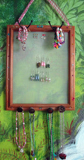 And to hold her fun jewelry, we made a little thing we saw on the internet. We used an old frame, added plastic mesh for earrings, added a few hooks and knobs for necklaces and bracelets, and a ribbon to hang it with. And Becky added stickers so it would be more decorative. It turned out pretty good.
